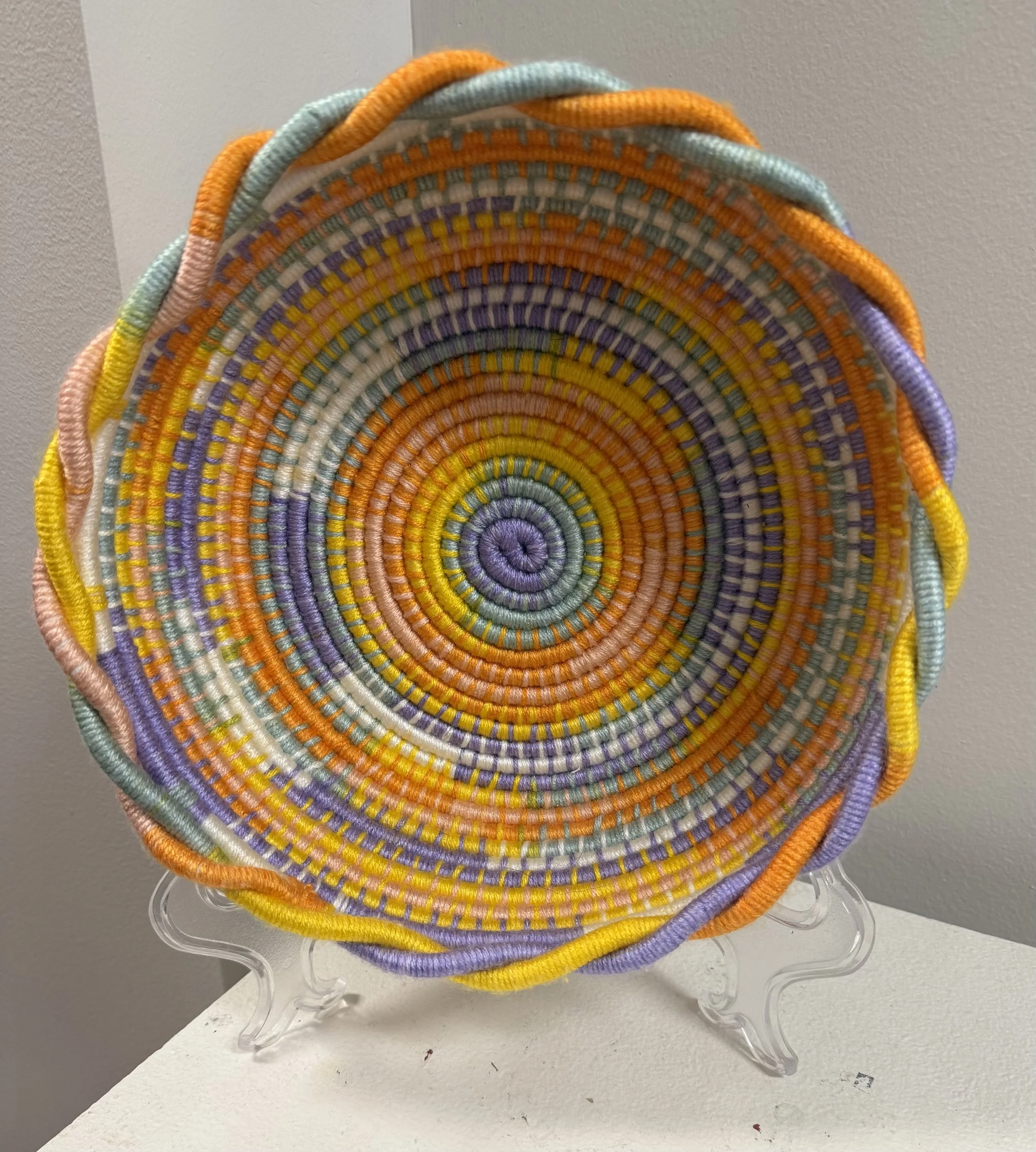 This is a two session class that requires you work on your basket in between sessions. In session one you will learn to create a coiled basket using coiling cord and yarn. In the second session you will learn to complete your basket using a decorative , woven border. Class includes 23 feet of coiling cord, two tapestry needles and your choice of yarn.