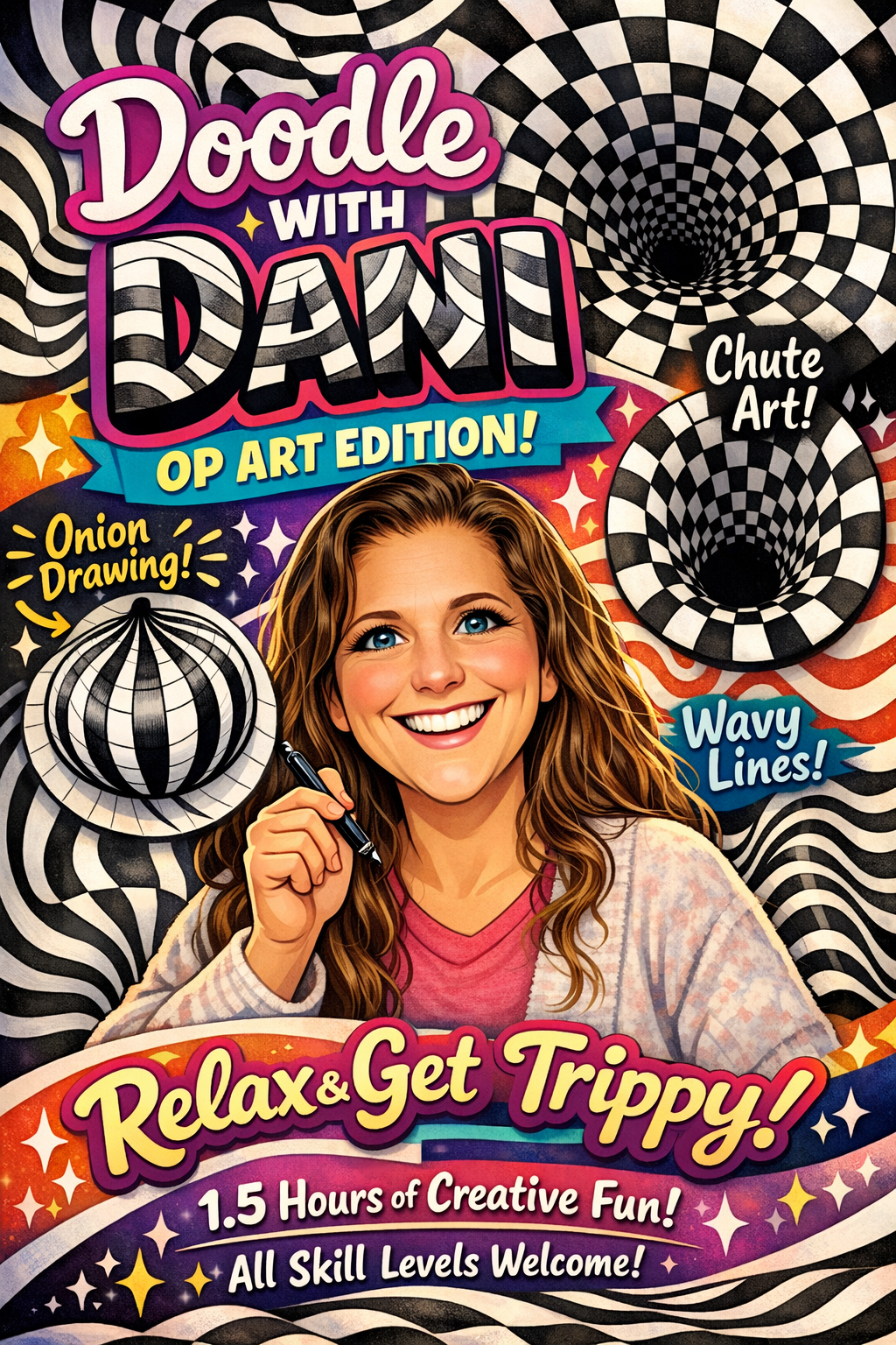Get ready to trick your eyes and unleash your creativity! In Doodle with Dani, we’ll dive into the bold, mesmerizing world of Op Art—where simple lines and shapes transform into mind-bending designs. This class is perfect for all skill levels and encourages playful exploration through guided doodling techniques.