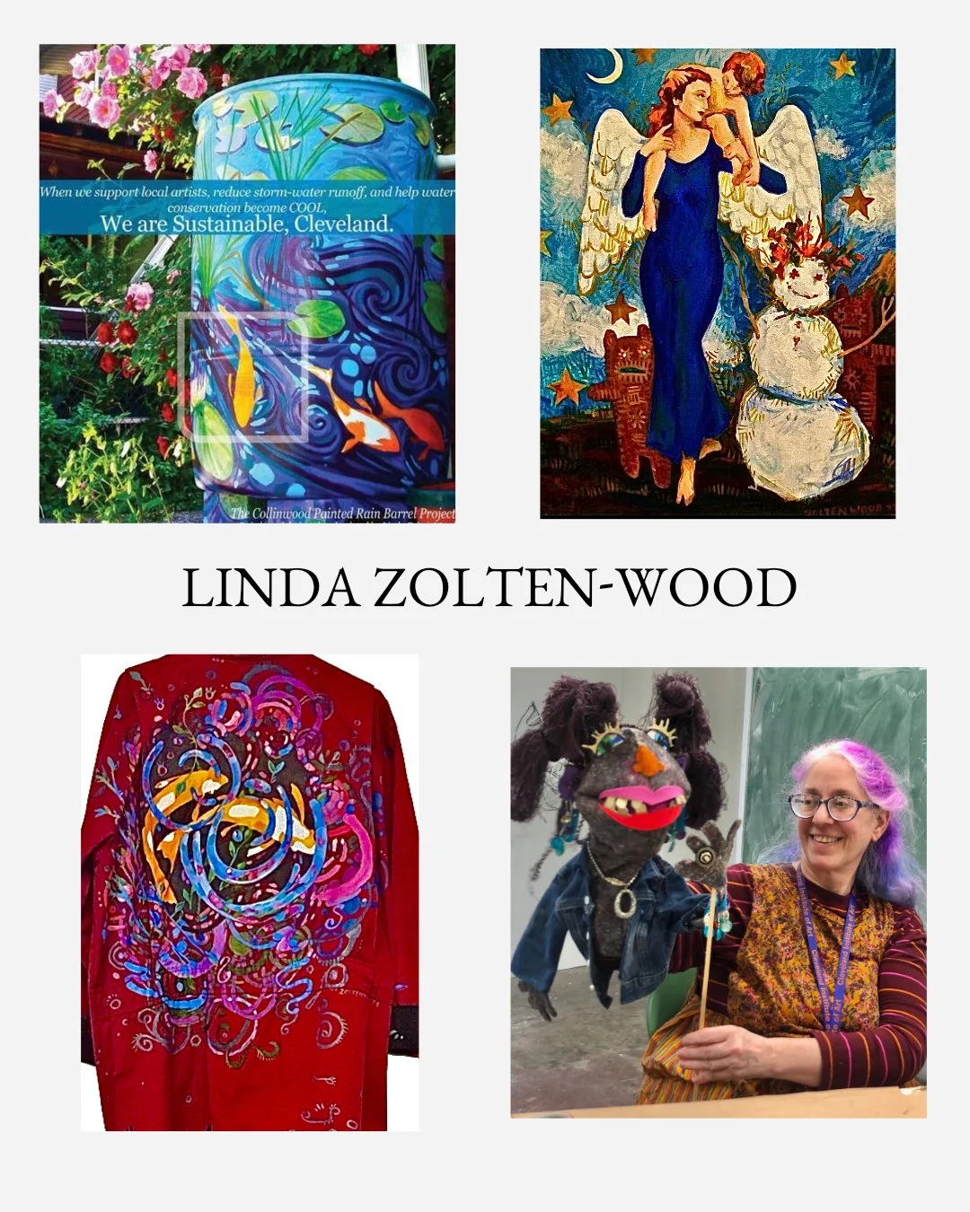 That commitment shows up across everything she touches: paintings rich with color and narrative, a hand-painted rain barrel installed in the community, wearable art, puppets. Linda moves between forms without apology, and the through-line is consistent — a saturated palette, imagery rooted in the natural world, and a generosity of spirit that reads immediately.